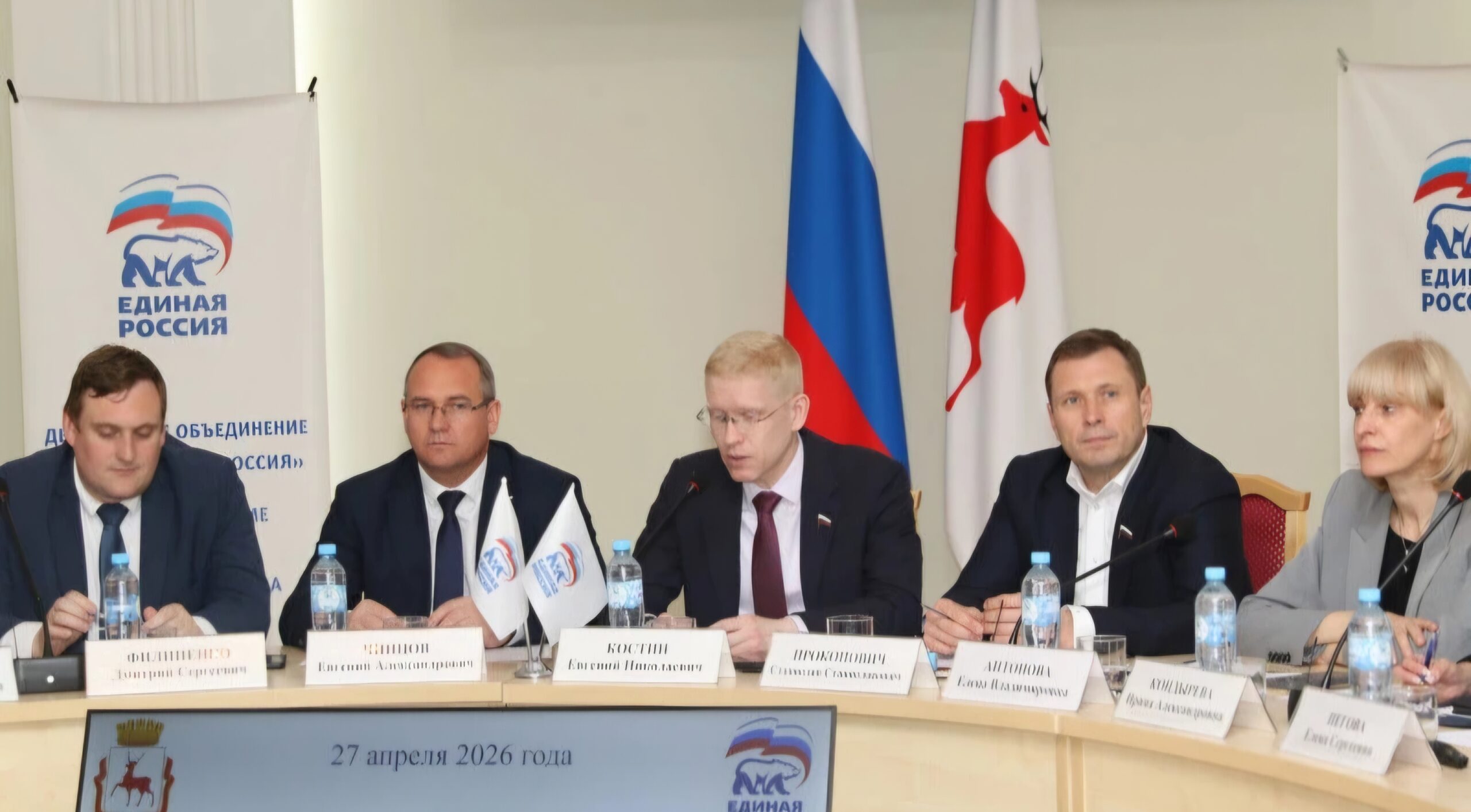 27 апреля 2026 года состоялось очередное собрание депутатского объединения «Единой России» в городской Думе Нижнего Новгорода под председательством руководителя партийного актива, первого заместителя спикера Думы Евгения Костина с участием председателя Думы, члена Генерального совета партии Евгения Чинцова, руководителя РИК партии Дмитрия Филипенко, представителей руководства администрации Нижнего Новгорода и секретарей местных отделений партии.